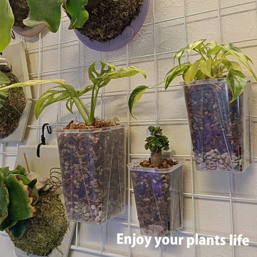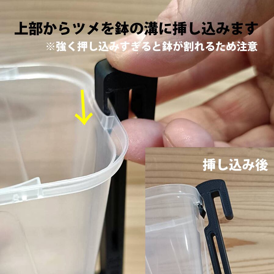 鉢にカチャっと取り付けて、ワイヤーネットや壁面に掛けることができます。